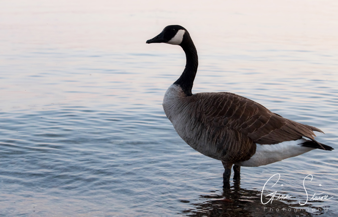 A Canada goose stands by calm water on a spring evening in Toronto, Ontario, Canada.