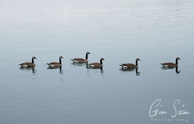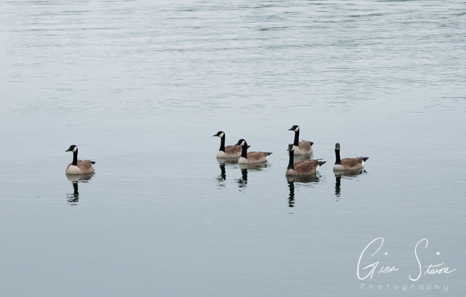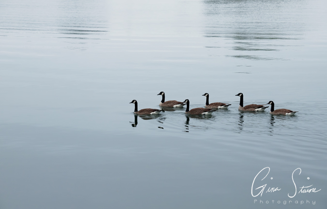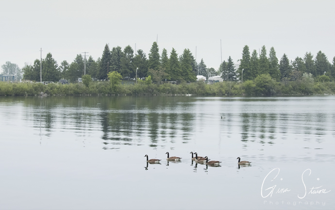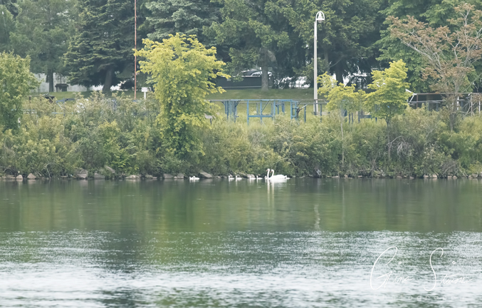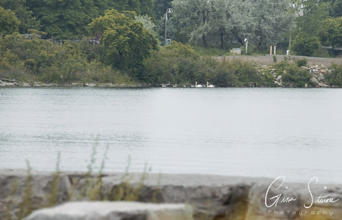 A mute swan family spending some time by the lake on a overcast spring evening in Toronto, Ontario, Canada.