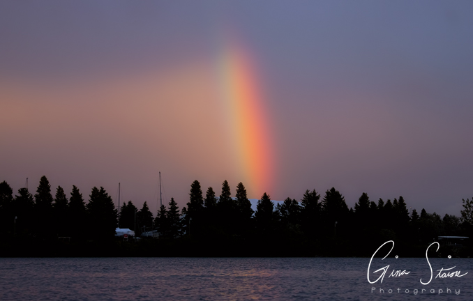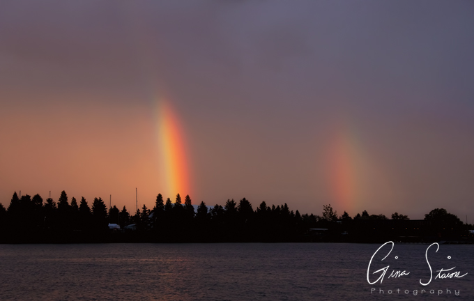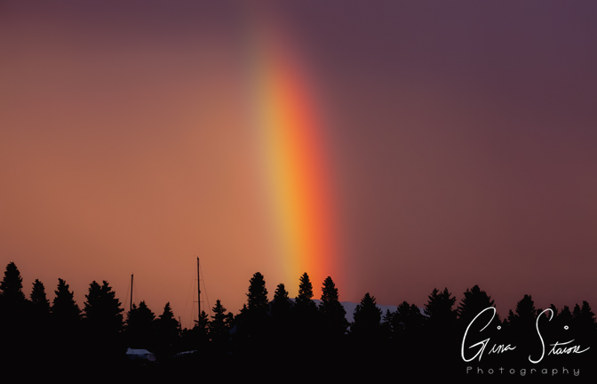 An intense golden hour and vivid rainbow follow a heavy rainstorm on a spring afternoon in Toronto, Ontario, Canada.