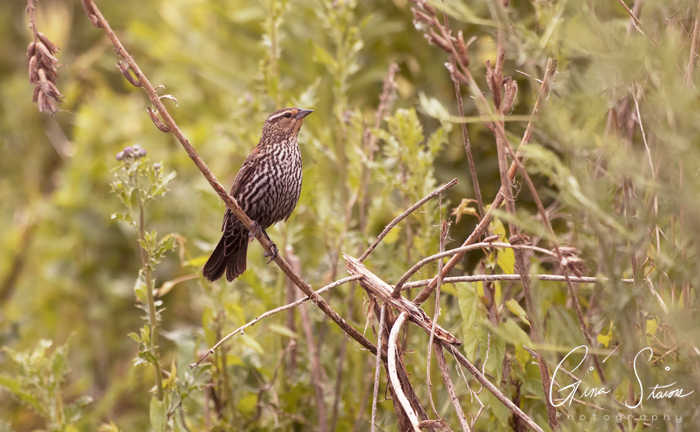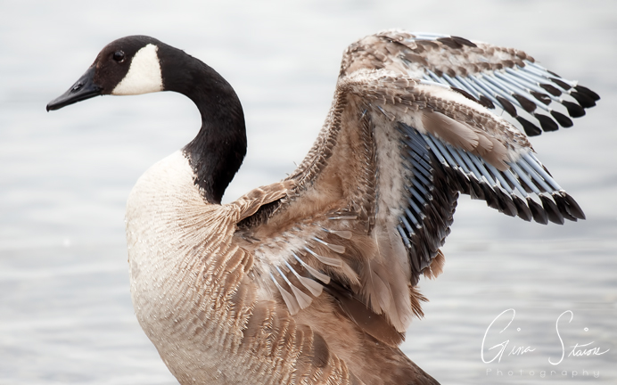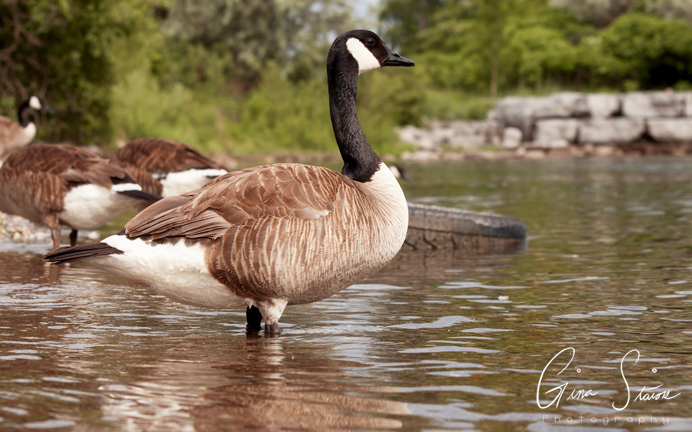 Canada geese and a female red-winged blackbird on a spring afternoon by the lake in Toronto, Ontario, Canada. A Canada goose shows off its pin feathers during molting season.