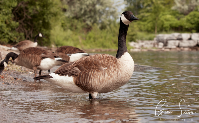 Canada geese, a common tern, and a red-winged blackbird spend a beautiful spring afternoon by the lake in Toronto, Ontario, Canada.