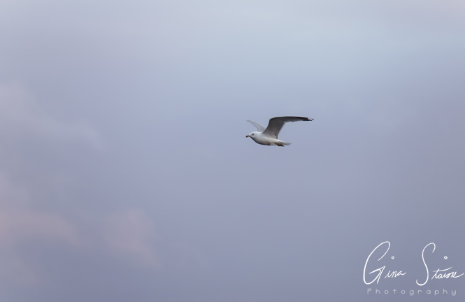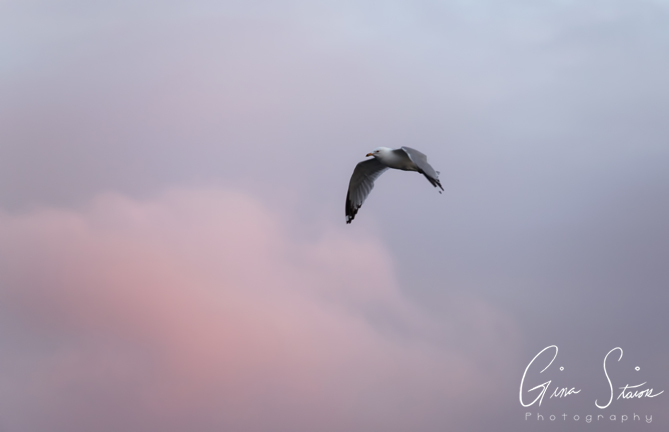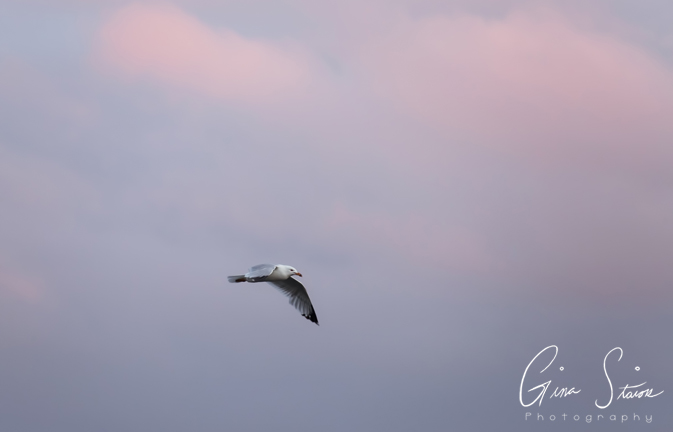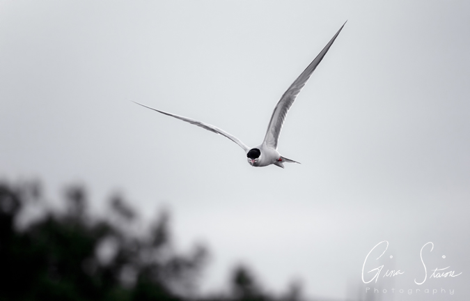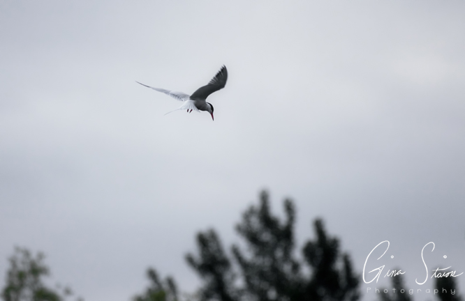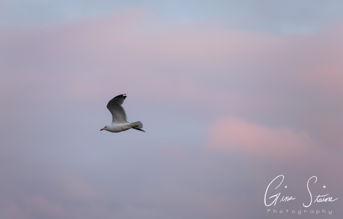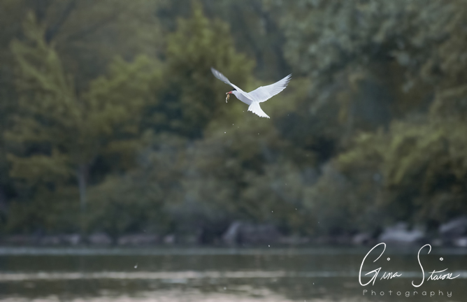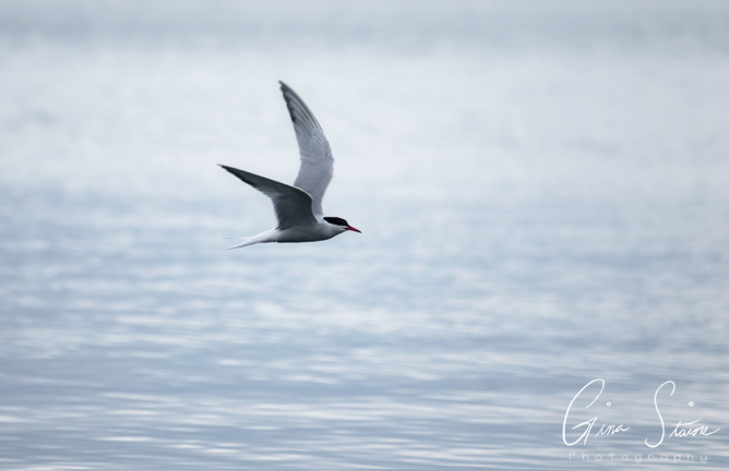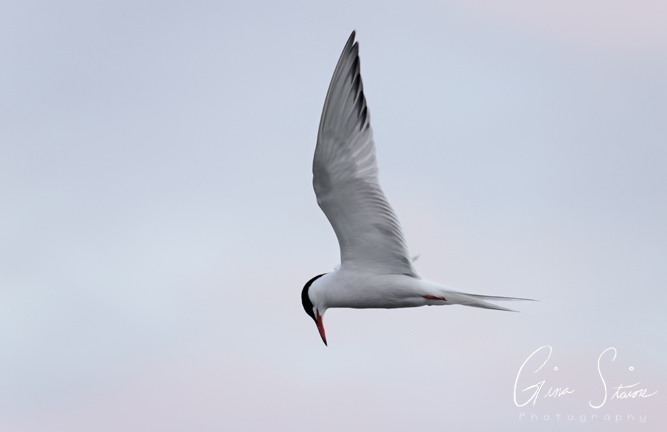 A common tern flies above the lake and against a sunset sky on a spring evening in Toronto, Ontario, Canada.