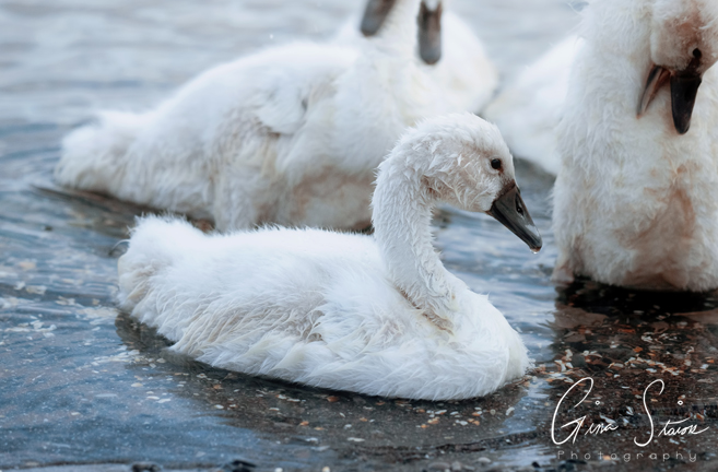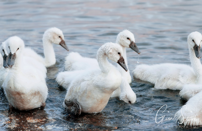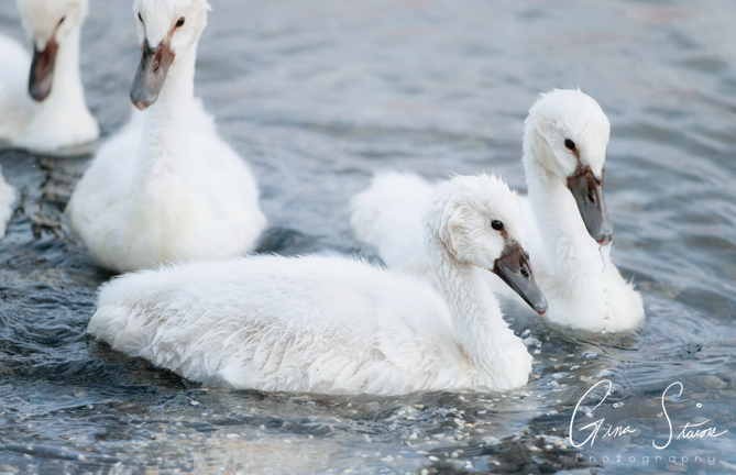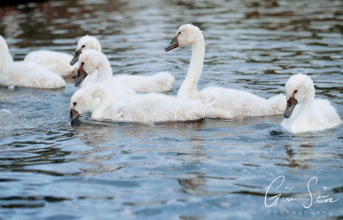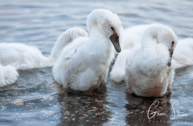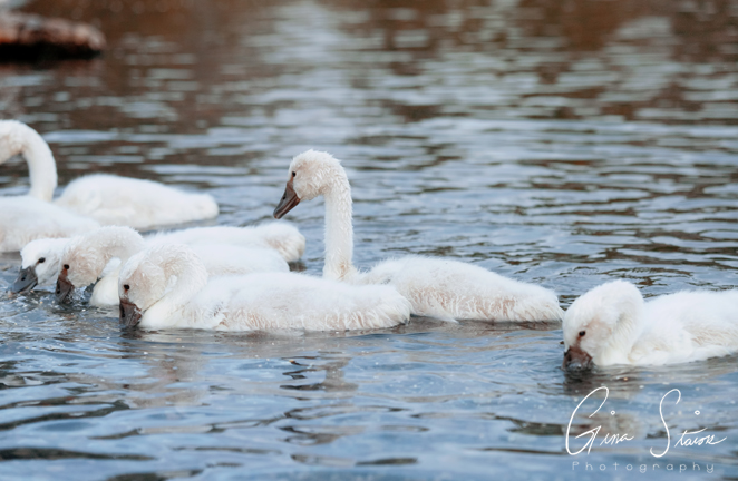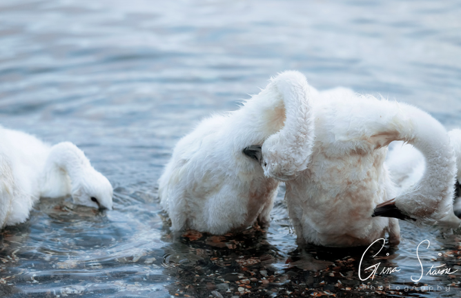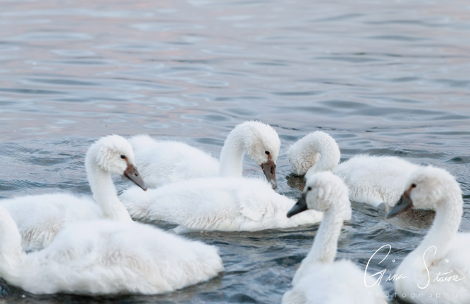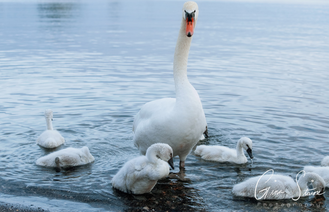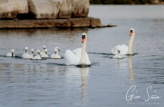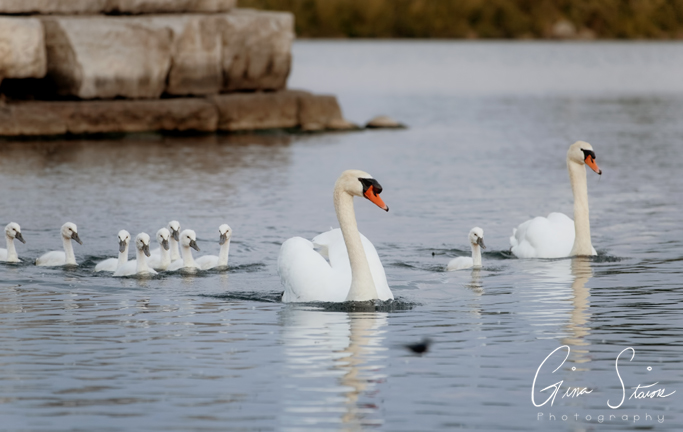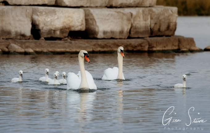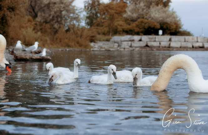 A mute swan family spends the afternoon by the lake during spring in Toronto, Ontario, Canada.