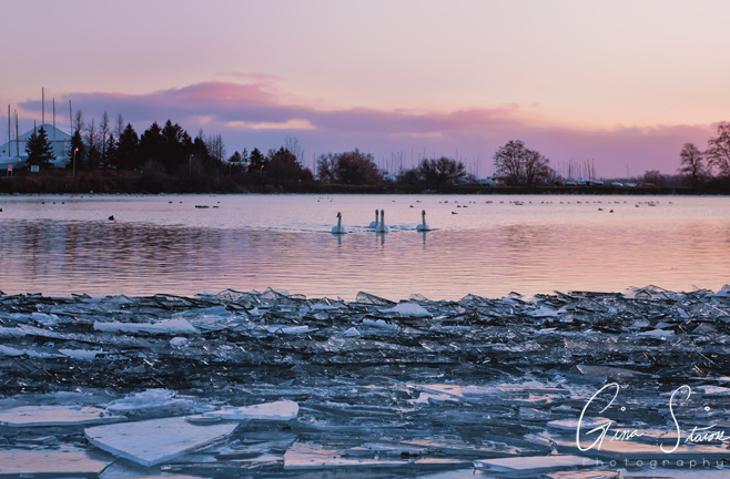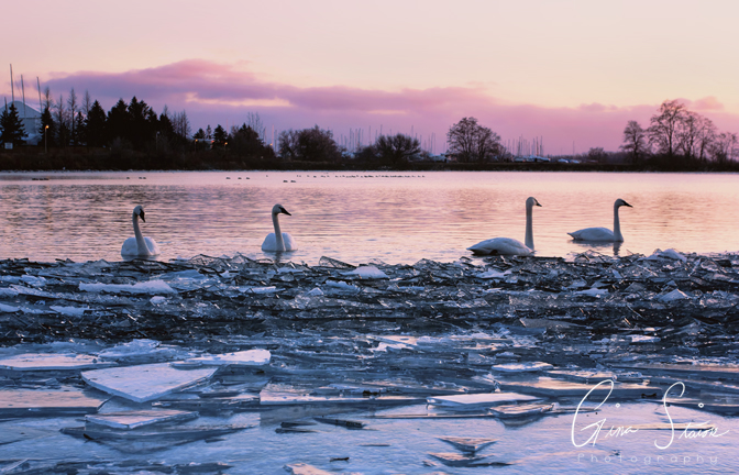 When it comes to getting the right photograph, sometimes you have to be at the right place at the right time. This was one of those instances. The sun was starting to set and I was so excited at the possibility of seeing a beautiful sunset while here. The lighting began to turn a lovely purple-pink colour and with the reflections on the blue ice, the scene looked magical. When I looked off to the side, I noticed a group of four swans swimming to the icy shore. They kept coming closer and I kept taking photos. Eventually, they swam off to the side but I was extremely happy and eager to get home to see the outcome of my shots.