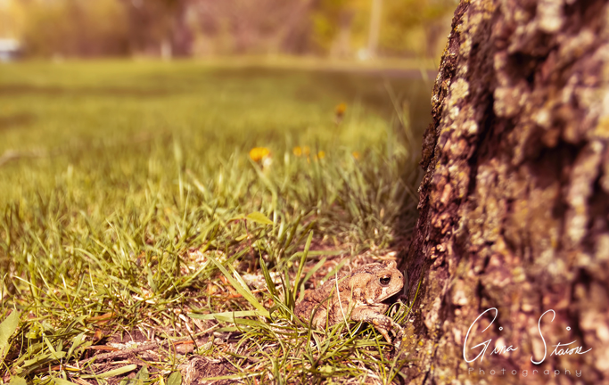 A frog hiding in green grass during a sunny afternoon during spring in Toronto, Ontario, Canada.