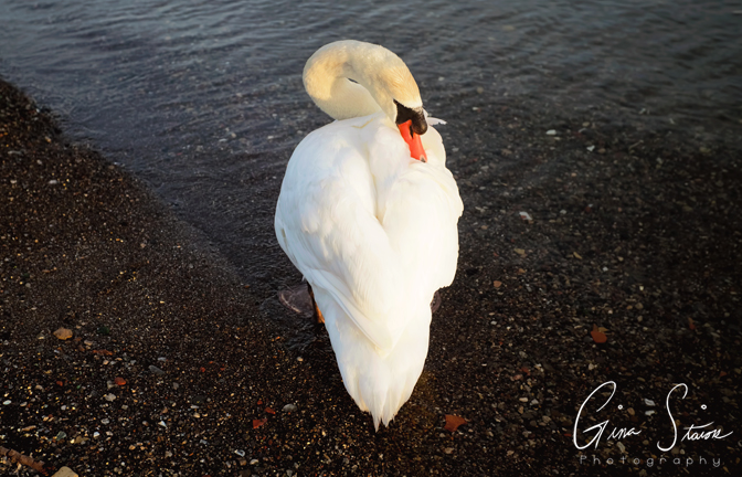 A male mute swan by the lake on a calm spring day in Toronto, Ontario, Canada.