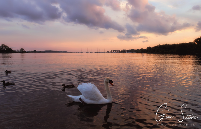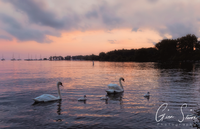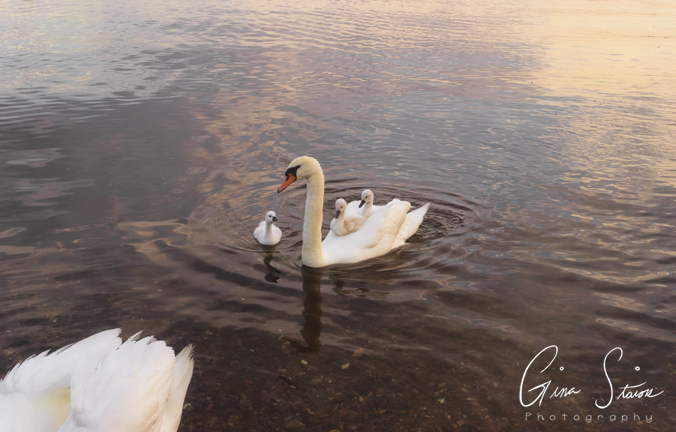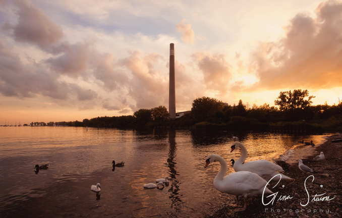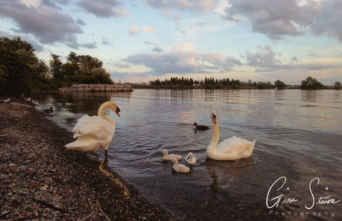 The swans came out to enjoy the sunset with me. I was able to get photos of a beautiful sunset and a beautiful family.