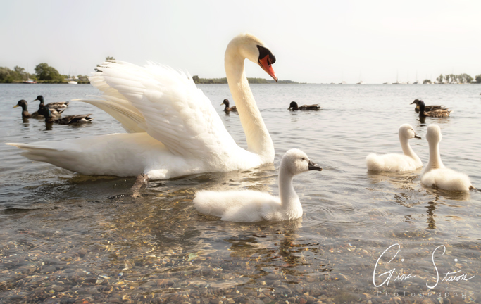 The swan family seemed to enjoy being out and about on this sunny summer day by the water in Toronto, Ontario, Canada.
