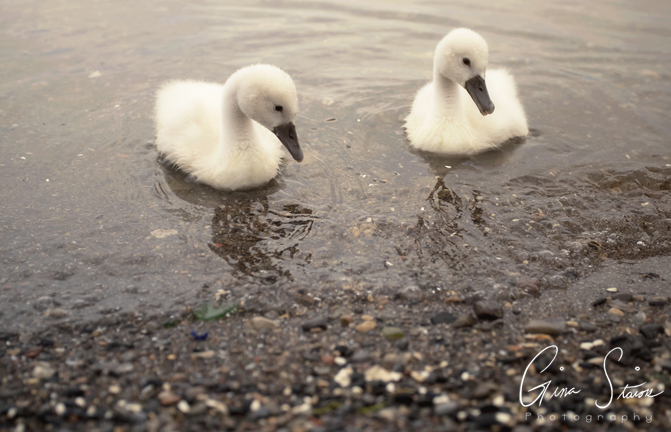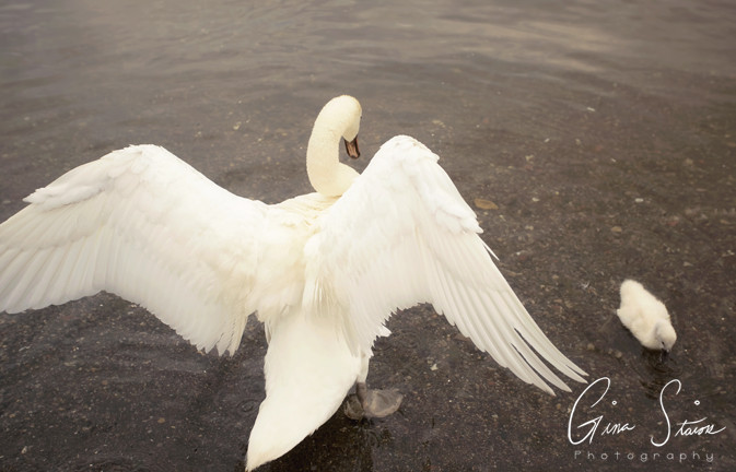 A swan family by the lake on a cloudy summer afternoon in Toronto, Ontario, Canada. Mama swan shows her baby the proper way to spread their wings.