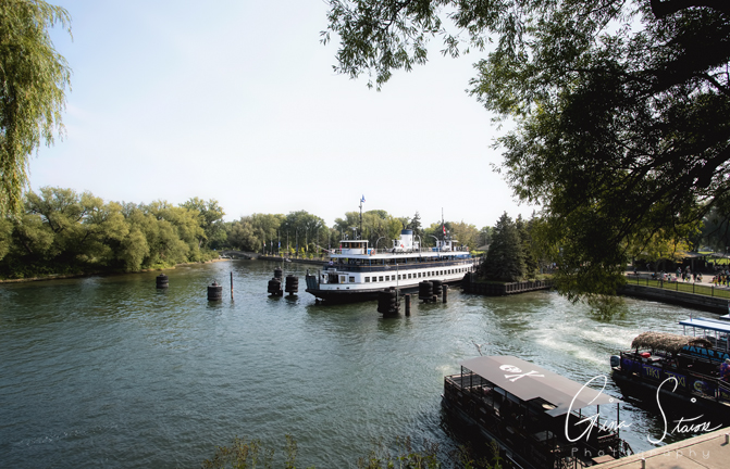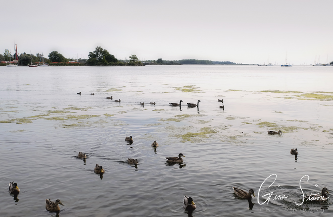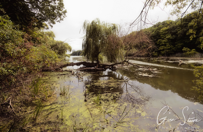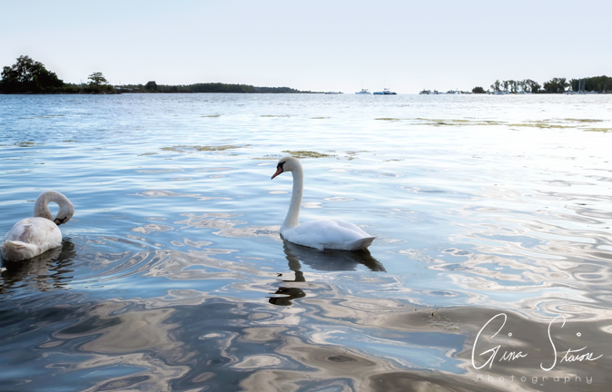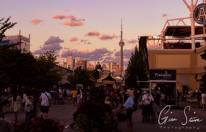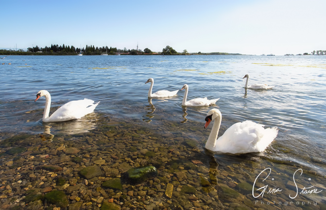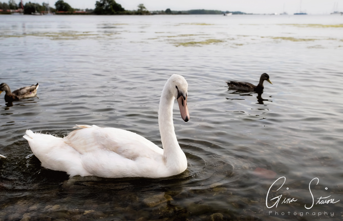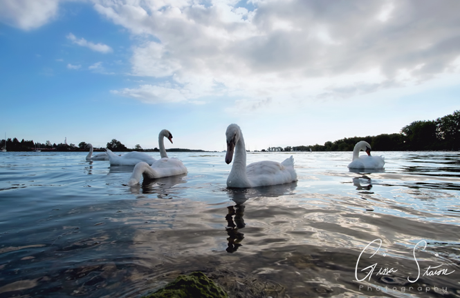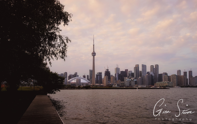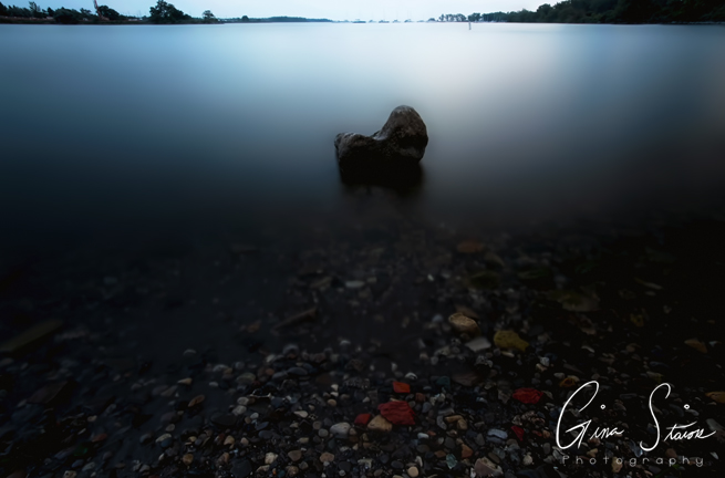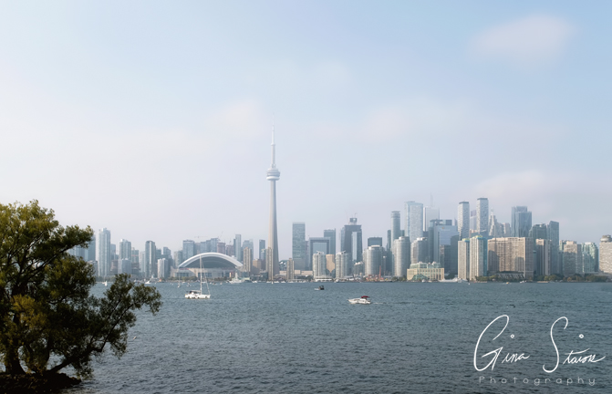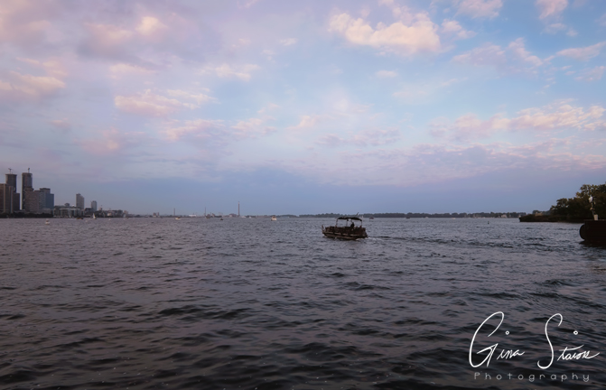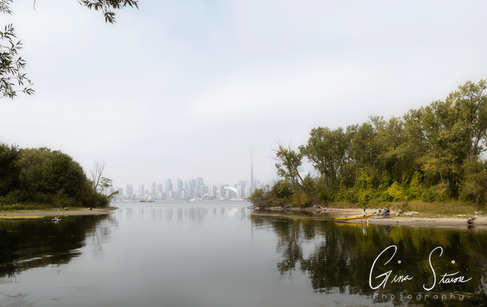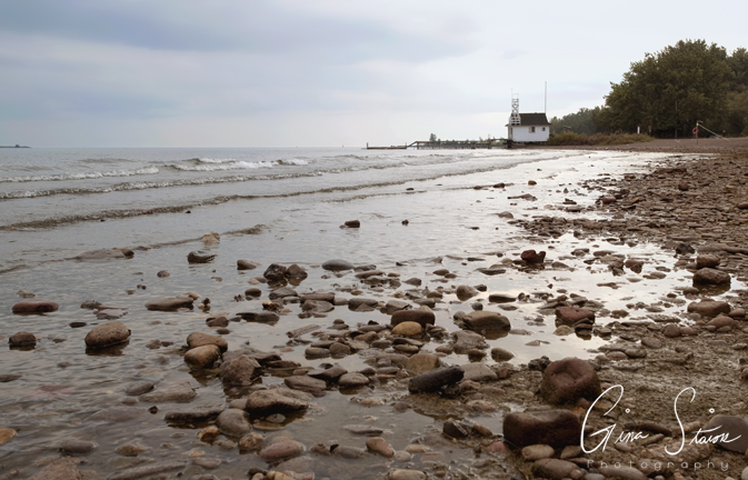 A hazy summer afternoon at the beach in Toronto, Ontario, Canada. Gentle waves lapped at the shore under a cloudy sky.