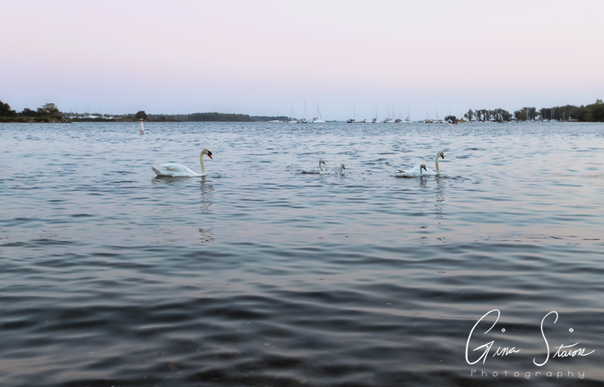 The swan parents and their growing cygnets swim along the water during a soft pastel sunset on a summer evening in Toronto, Ontario, Canada.