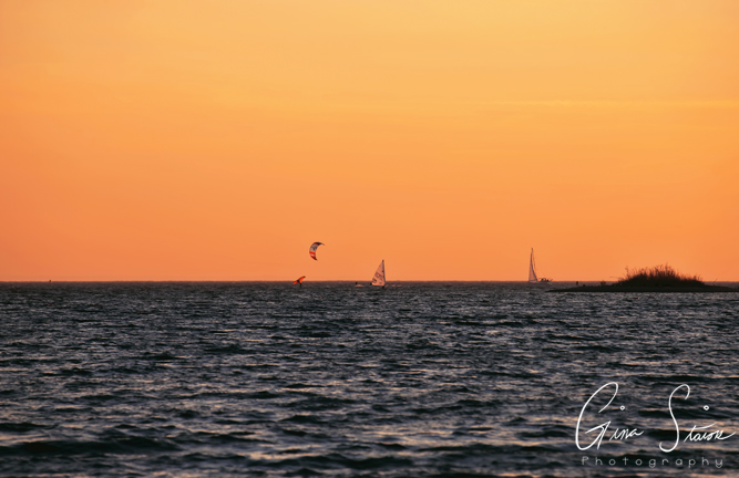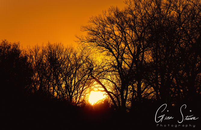 The sun shines on from beyond the bare tree branches above the lake on an autumn evening in Toronto, Ontario, Canada.