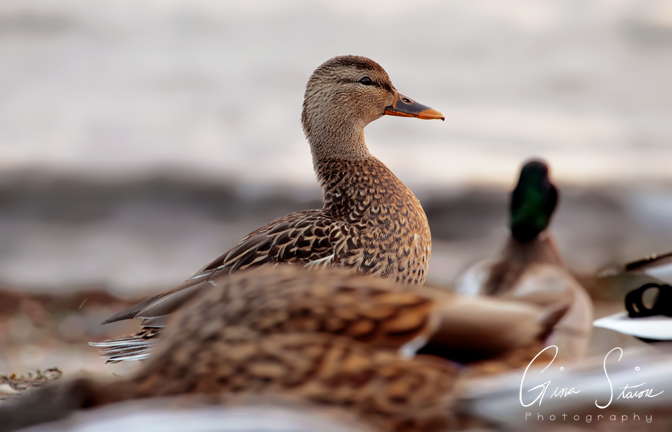 A female mallard duck among her peers on the beach in Toronto, Ontario, Canada.