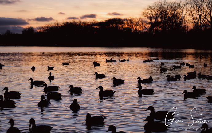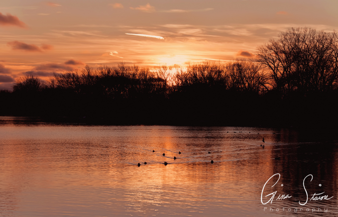 An orange and yellow sunset by the lake eventually paints the sky in shades of blue and pink during a winter evening in Toronto, Ontario, Canada.