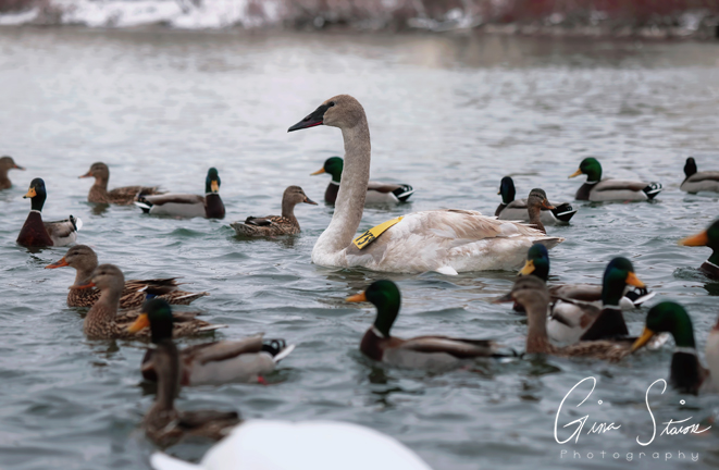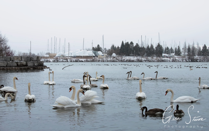 Trumpeter swans, mute swans, mallard ducks, and buffleheads swim around Lake Ontario during a cloudy winter afternoon in Toronto, Ontario, Canada.