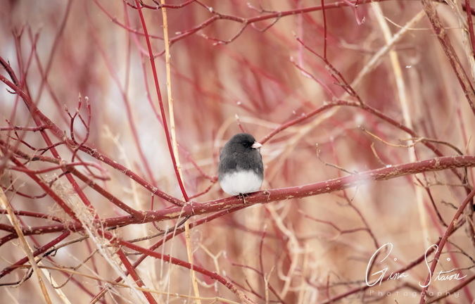 A dark-eyed junco sits on a red branch during a winter afternoon in Toronto, Ontario, Canada.