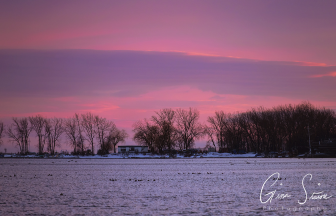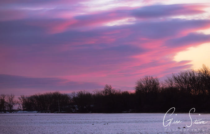 The sky turns into beautiful shades of pink and purple during sunset above the lake in Toronto, Ontario, Canada.