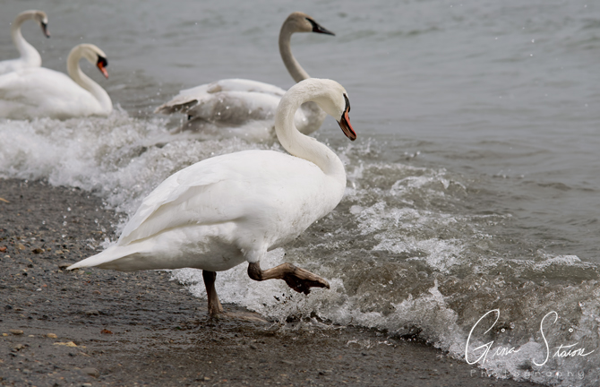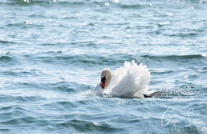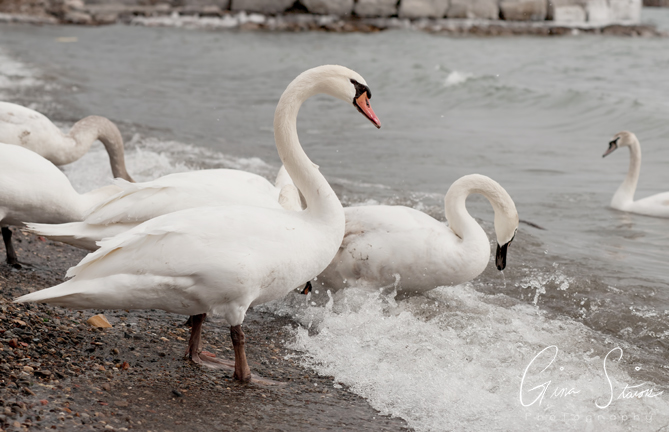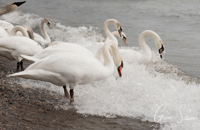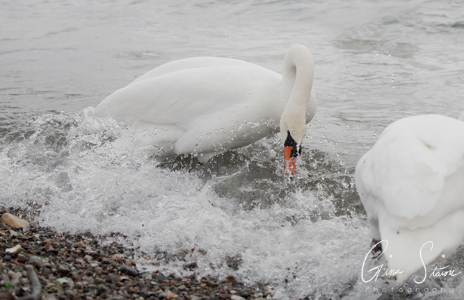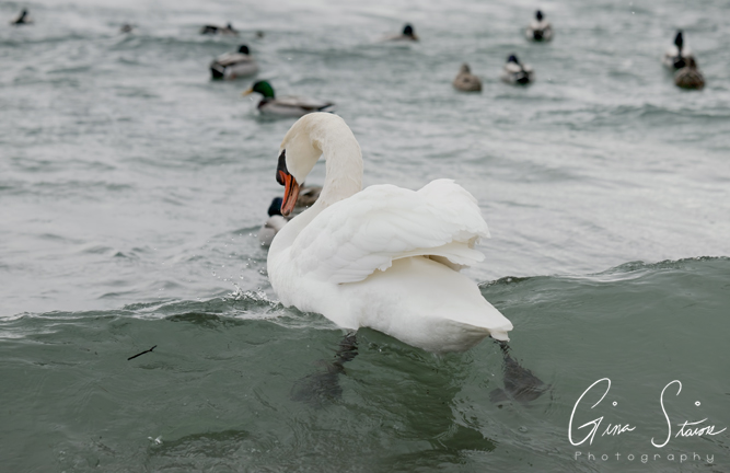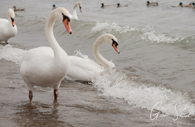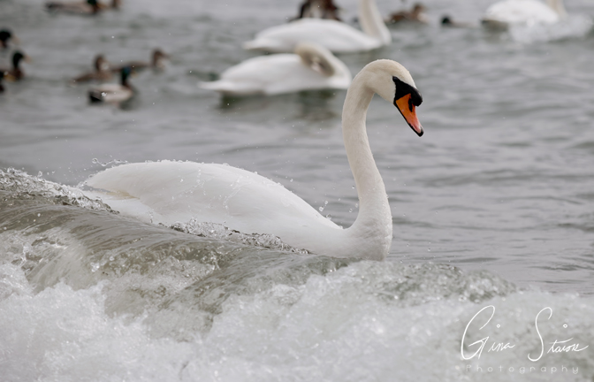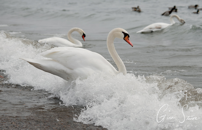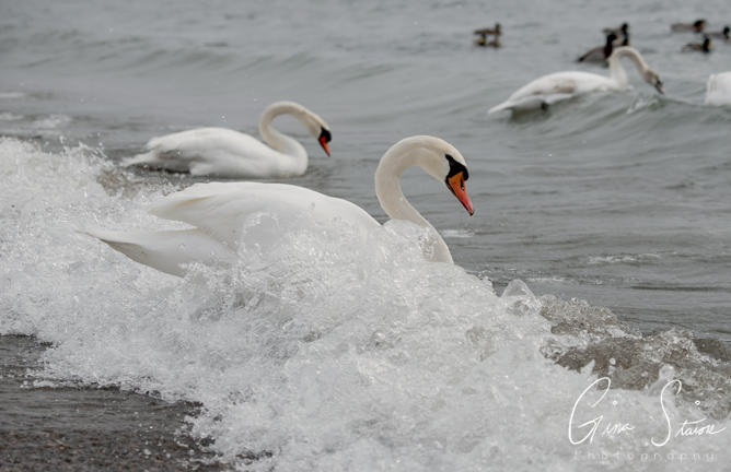 Swans brave rough water by Lake Ontario on a very windy day in Toronto, Ontario, Canada.