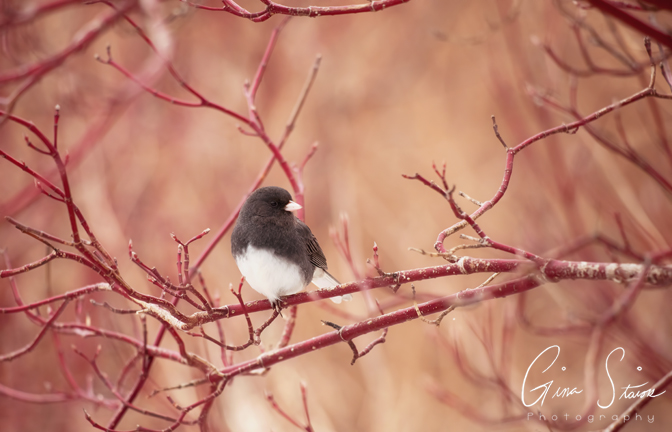 A dark-eyed junco sits on a red branch during a winter afternoon in Toronto, Ontario, Canada.