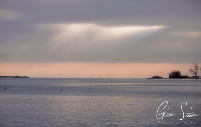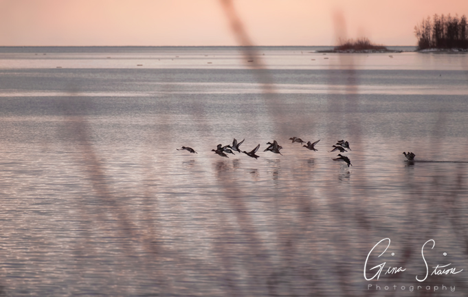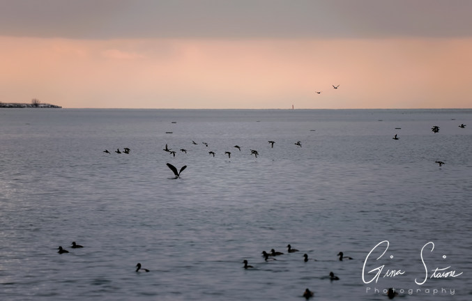 Flocks of birds fly above Lake Ontario during sunset in Toronto, Ontario, Canada.