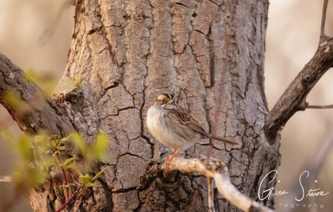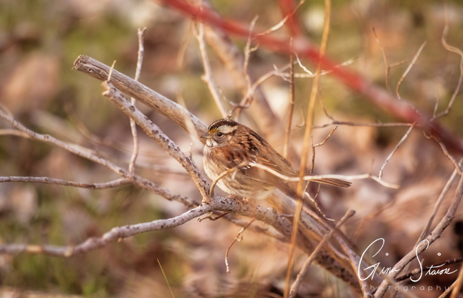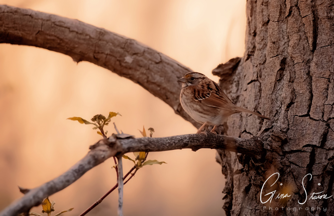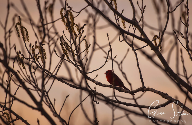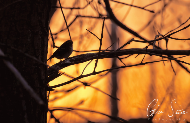 White throated sparrows and northern cardinals perch on bare tree branches during an orange sunset on a spring evening in Toronto, Ontario, Canada.