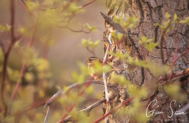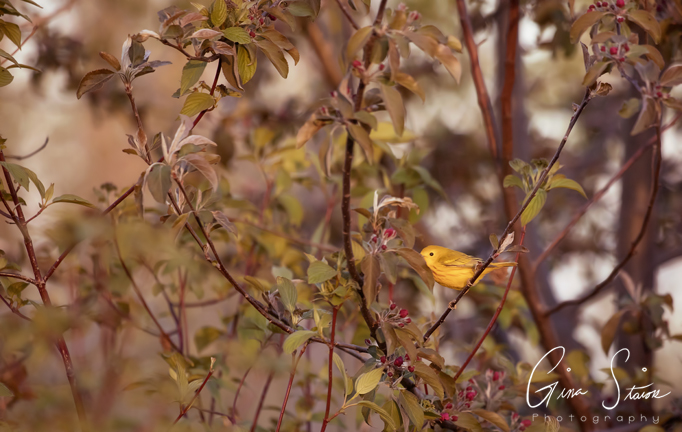A yellow warbler seems to hide behind a leaf during golden hour on a spring evening in Toronto, Ontario, Canada.