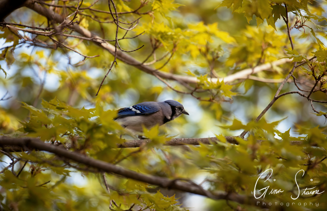 A blue jay perches on a tree branch while surrounded by green foliage on a spring afternoon in Toronto, Ontario, Canada.