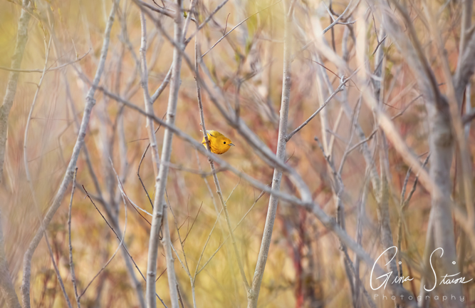 A yellow warbler perches on a bare tree branch during a spring day in Toronto, Ontario, Canada.