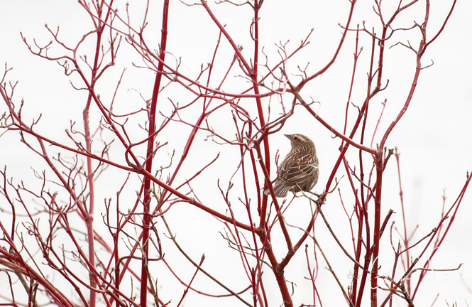 A female red-winged blackbird perches on bare tree branches on a cloudy spring day in Toronto, Ontario, Canada.