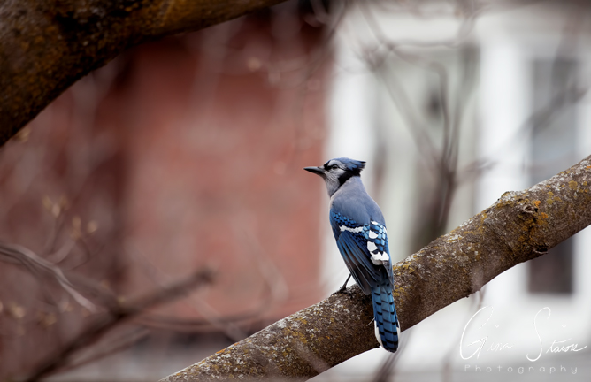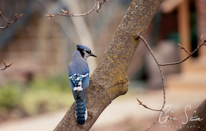 A pretty blue jay perches on a bare tree branch during a cloudy spring afternoon in Toronto, Ontario, Canada.