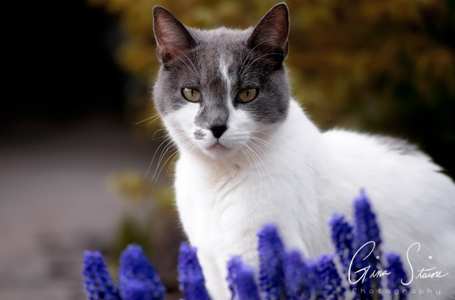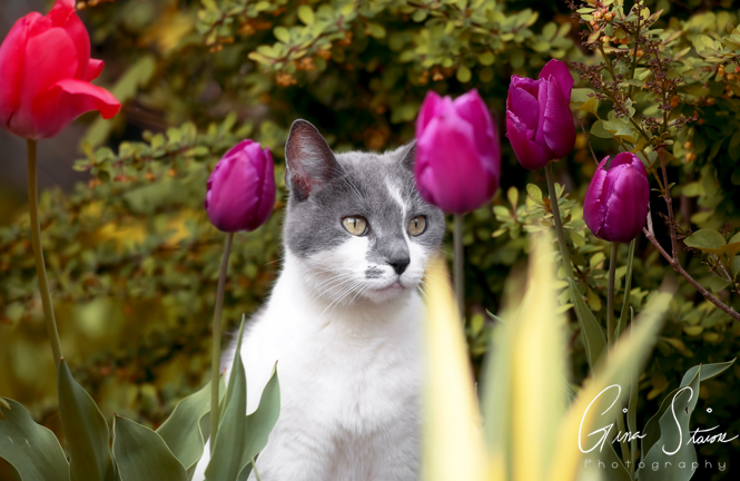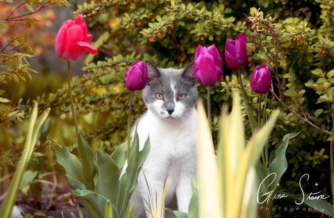 An adorable grey and white cat poses with spring flowers during a sunny afternoon in Toronto, Ontario, Canada.