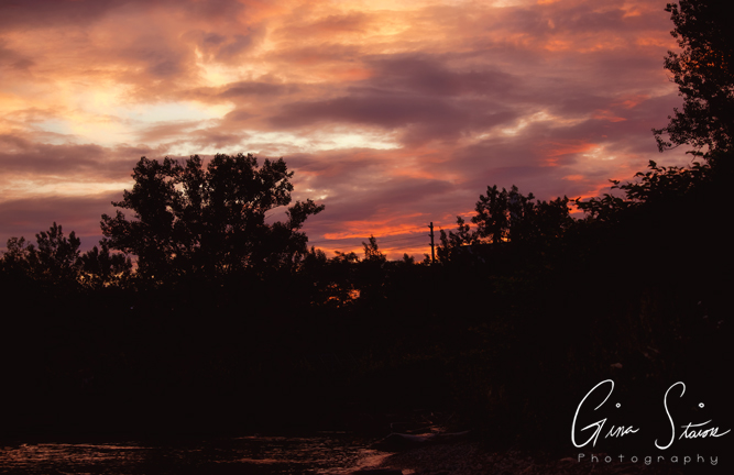 A red, pink, and purple sunset lights up the sky during a peaceful summer evening in Toronto, Ontario, Canada.