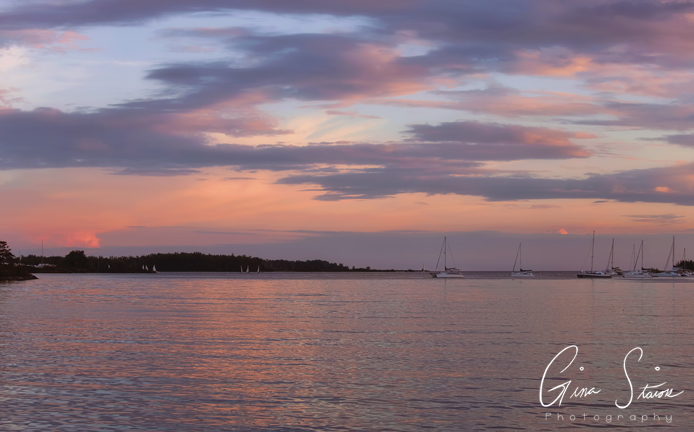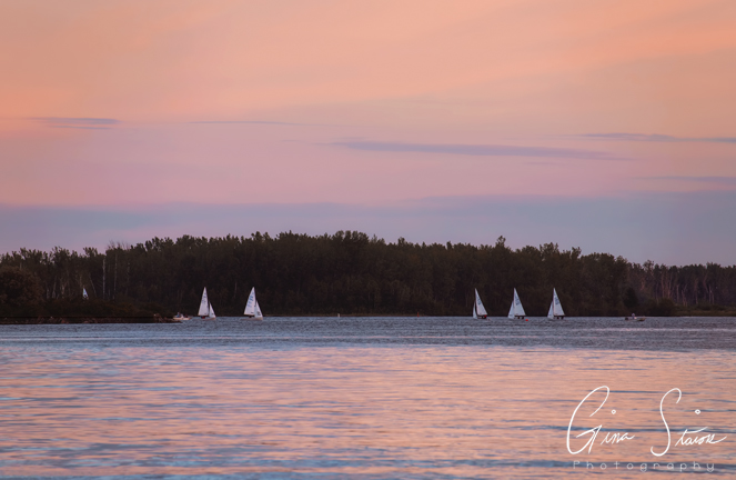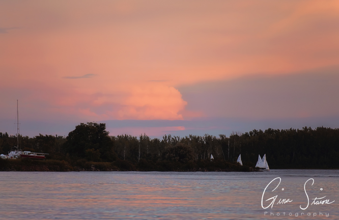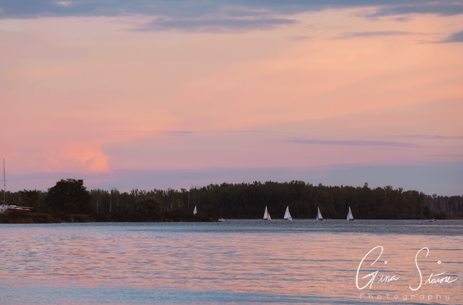 A soft orange and purple sunset lights up the sky above the lake on a peaceful summer evening in Toronto, Ontario, Canada.
