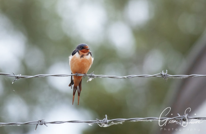 A barn swallow perches on a metal wire on a summer afternoon in Toronto, Ontario, Canada.