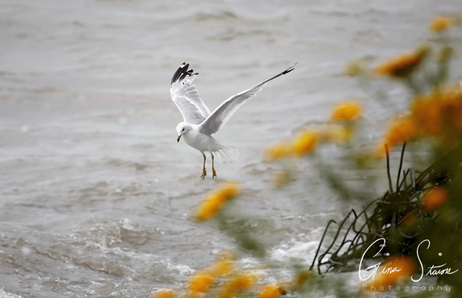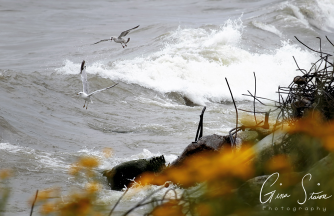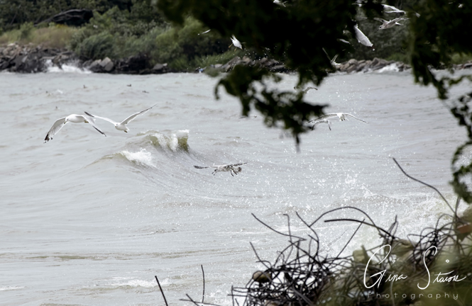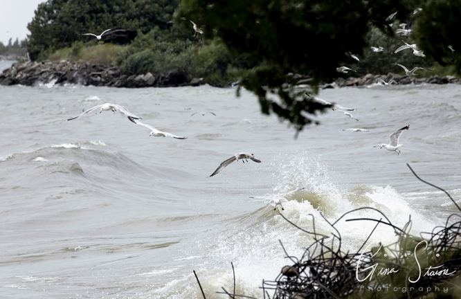 A flock of seagulls attempt to take flight on a cloudy and windy day by the lake in Toronto, Ontario, Canada.