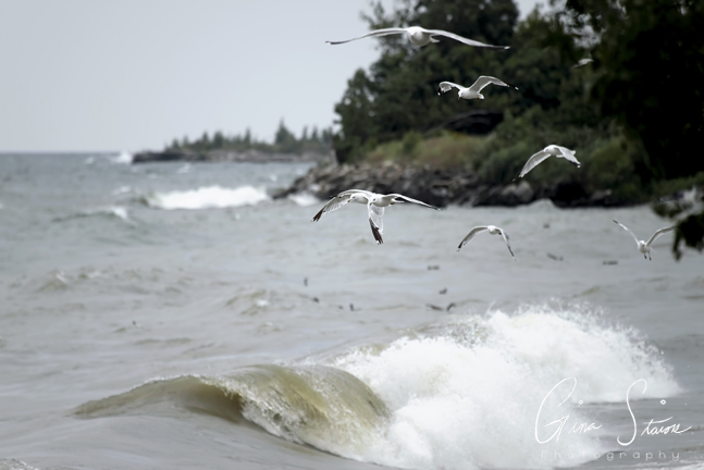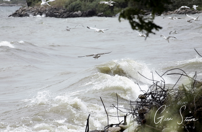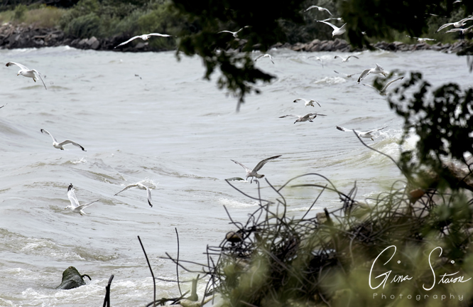 A flock of seagulls attempt to take flight on a cloudy and windy day by the lake in Toronto, Ontario, Canada.