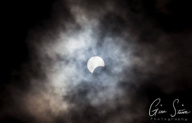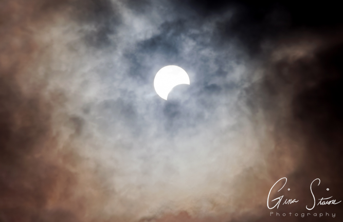 The sun as seen during a partial solar eclipse on a cloudy afternoon in Toronto, Ontario, Canada.