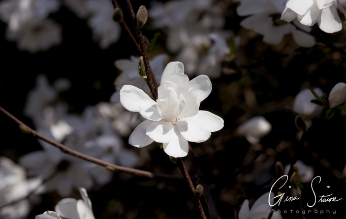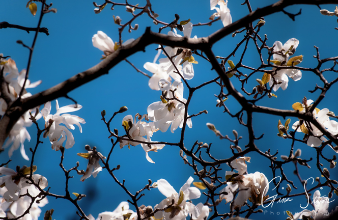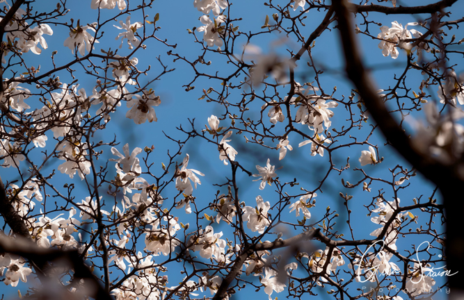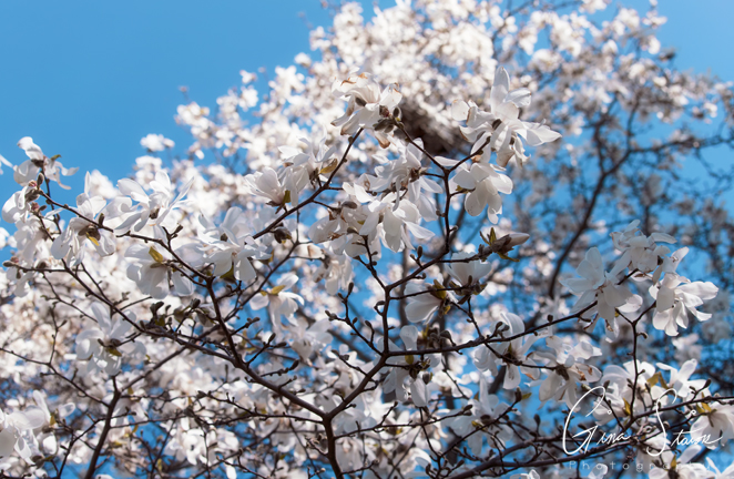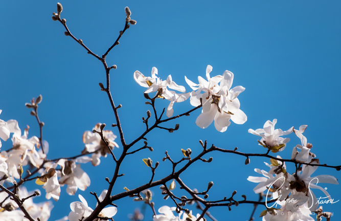 White magnolias against a clear blue sky on a spring afternoon in Toronto, Ontario, Canada.