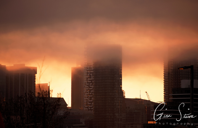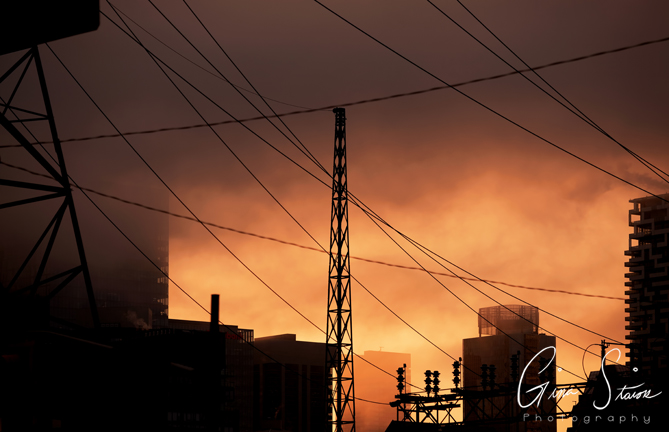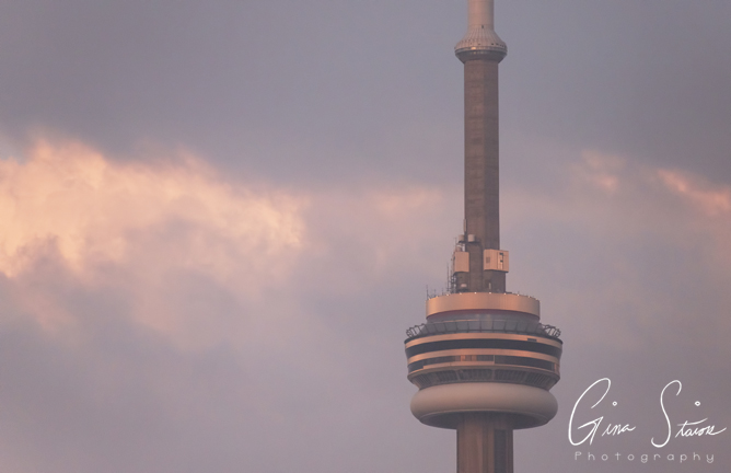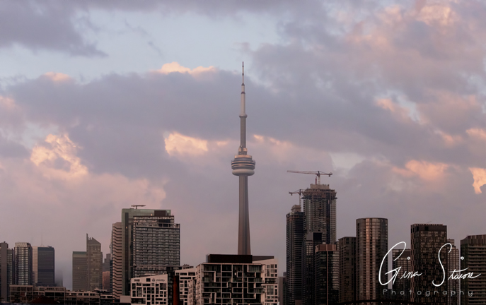 Hazy scenes in the city during sunset on a spring evening in Toronto, Ontario, Canada.