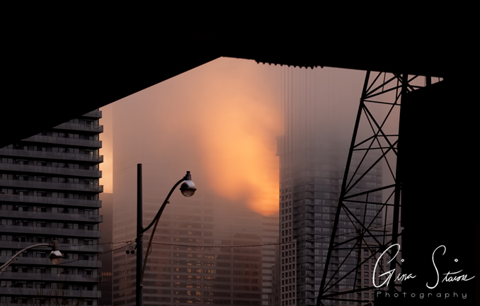 Hazy scenes in the city during sunset on a spring evening in Toronto, Ontario, Canada.