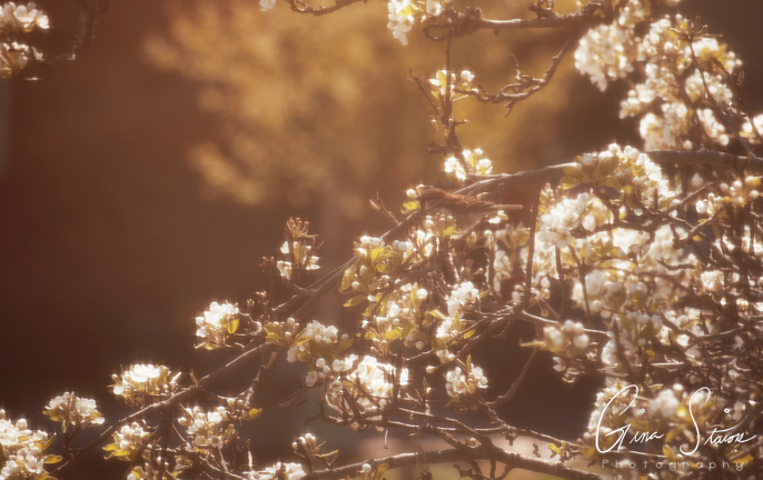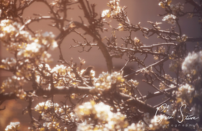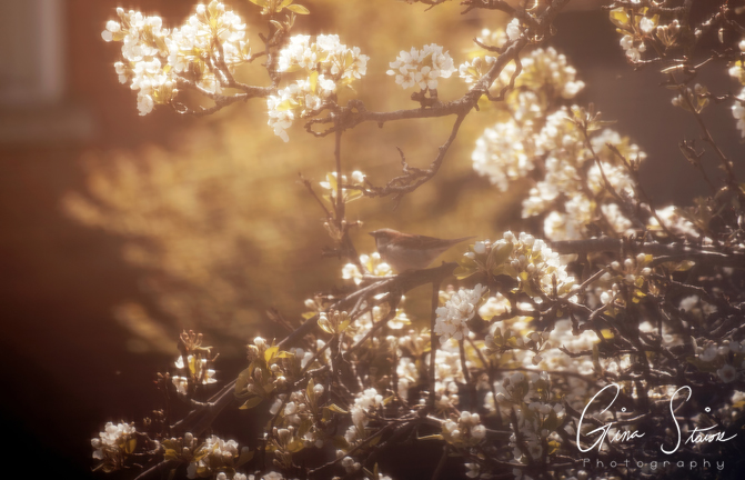 A sparrow hidden amongst the tree branches and white flowers on a spring afternoon in Toronto, Ontario, Canada.