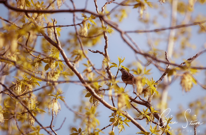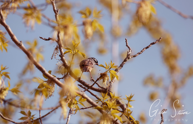 A Baltimore oriole, a white-crowned sparrow, and an unknown bird in shadow on a spring day in Toronto, Ontario, Canada.