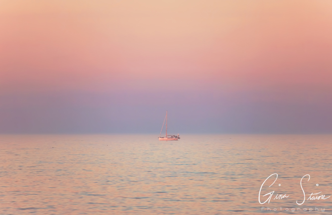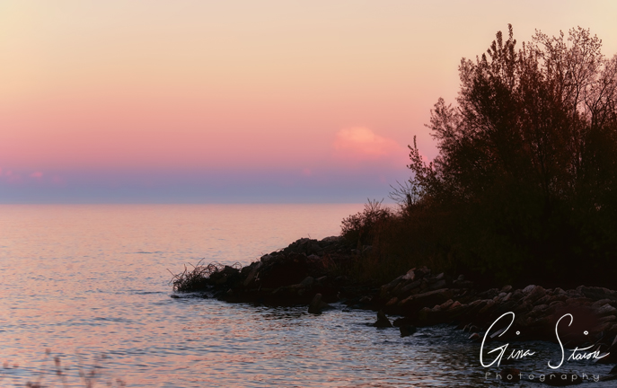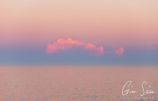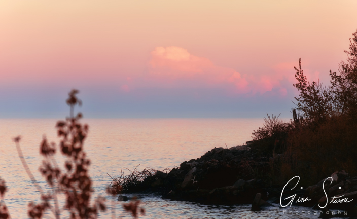A soft sunset and pink fluffy clouds light up the sky above Lake Ontario on a spring evening in Toronto, Ontario, Canada.