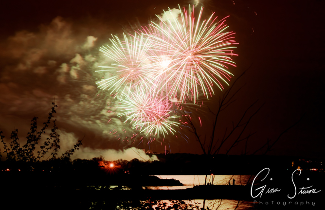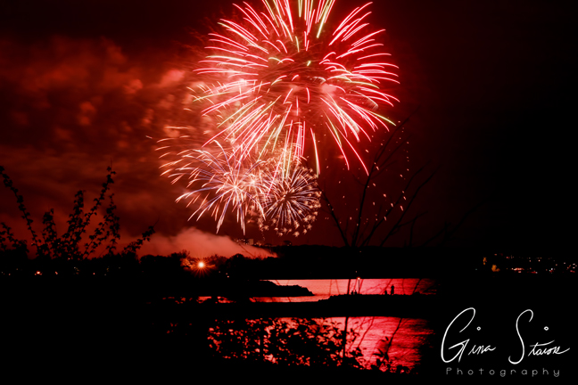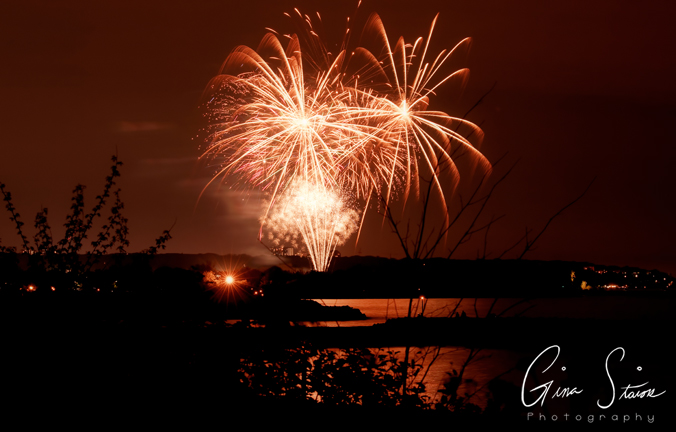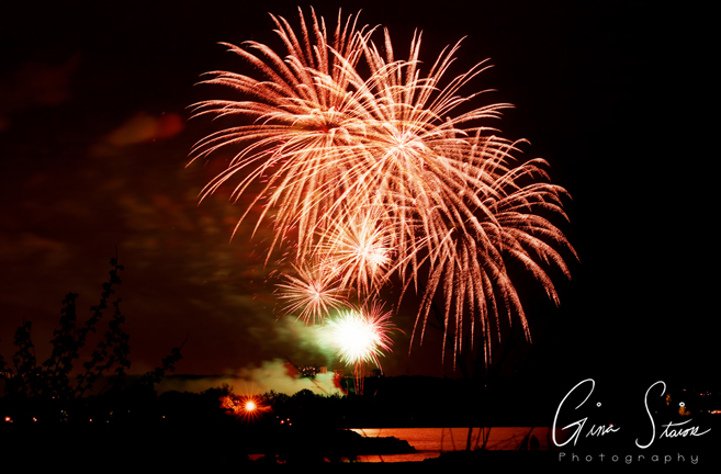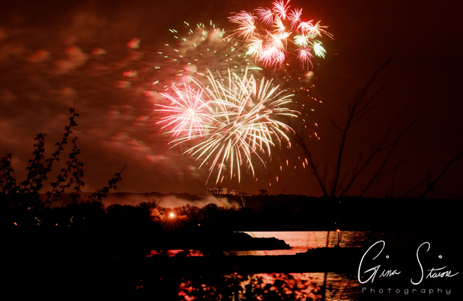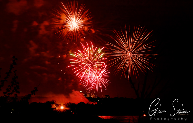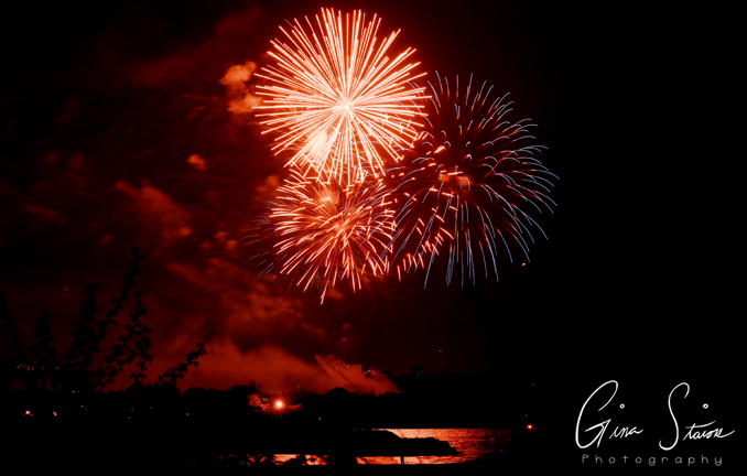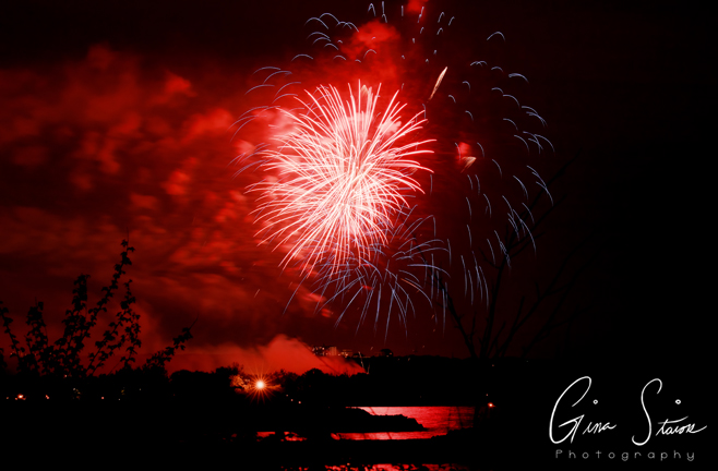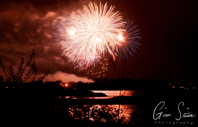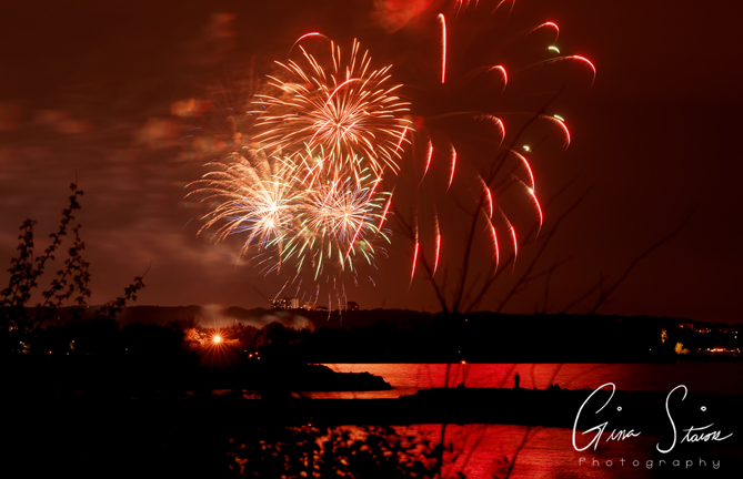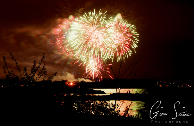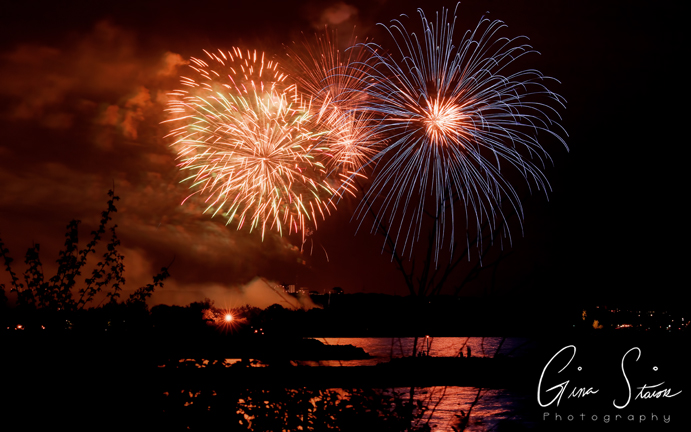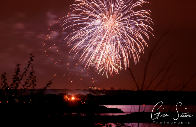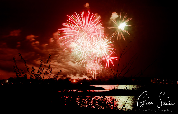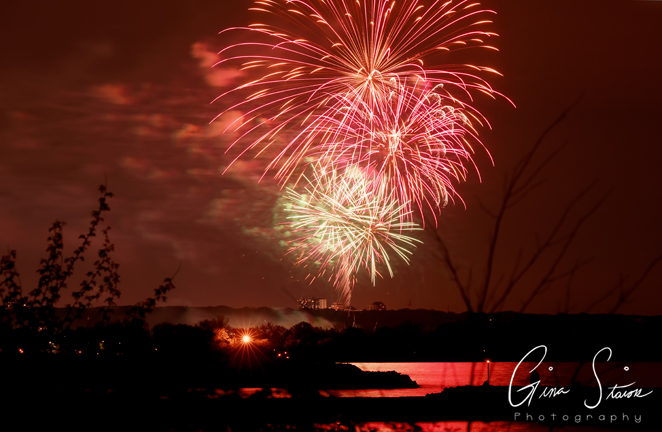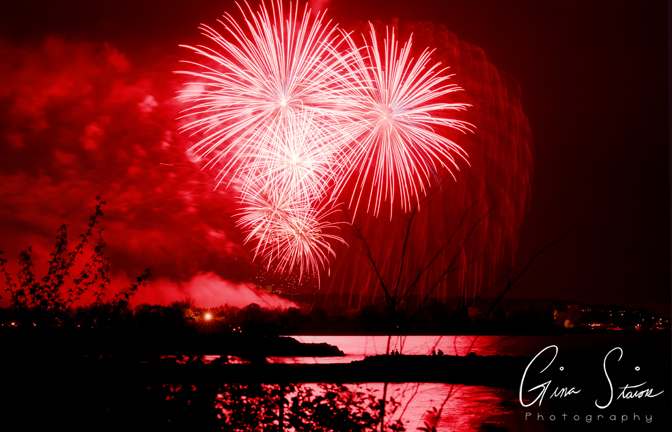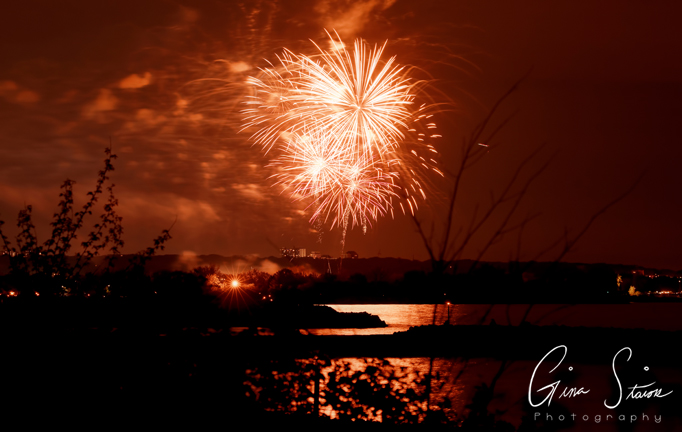 Beautiful fireworks light up the night sky and Lake Ontario below on Victoria Day weekend in Toronto, Ontario, Canada.
