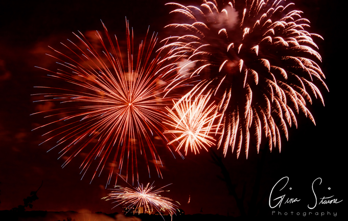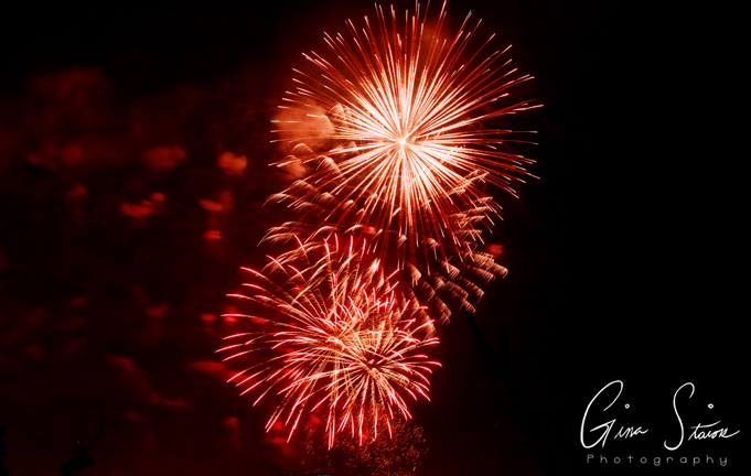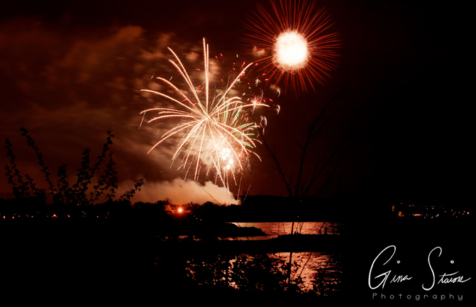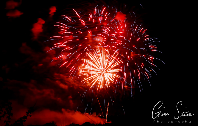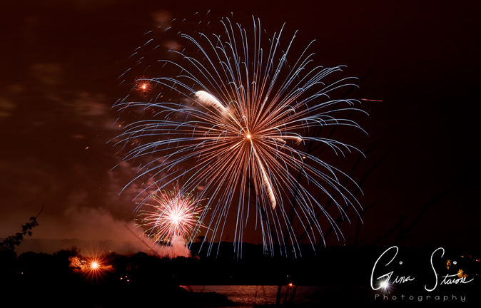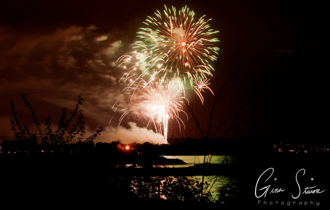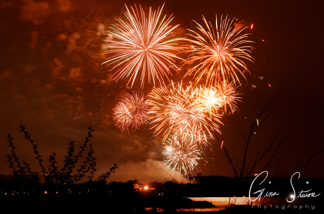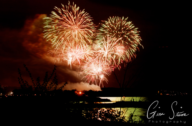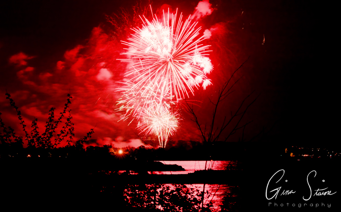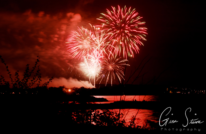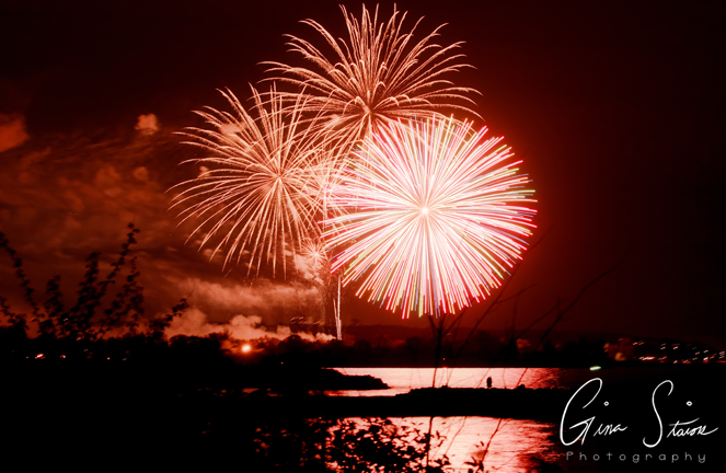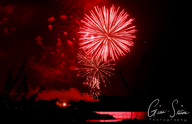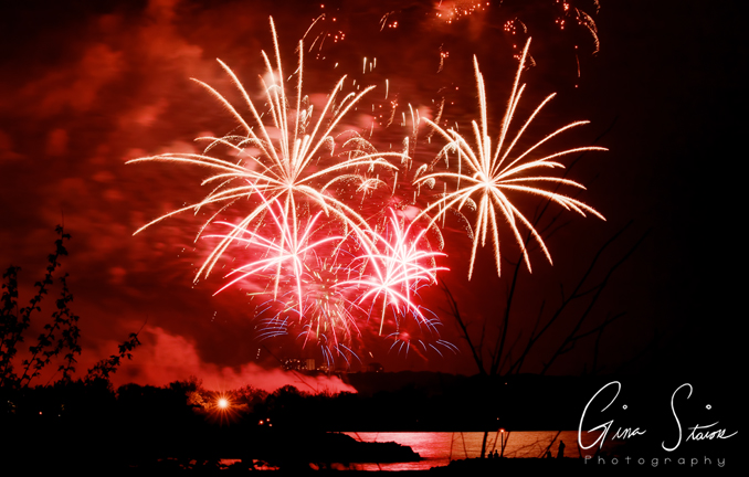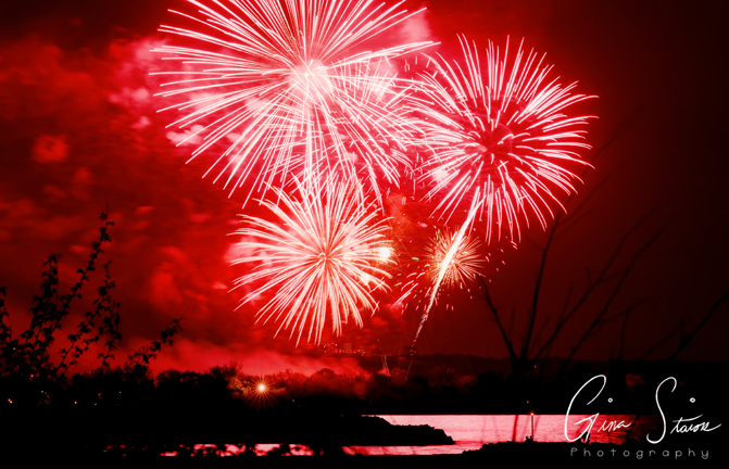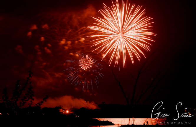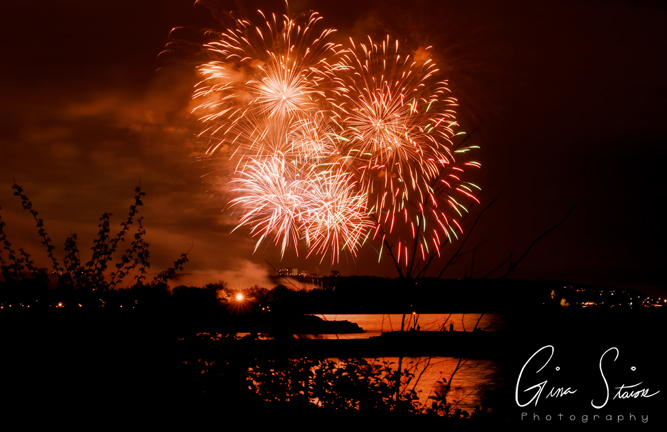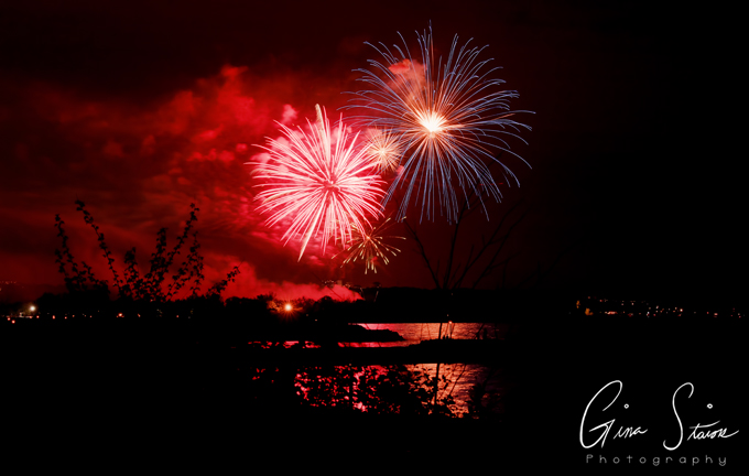 Beautiful fireworks light up the night sky and Lake Ontario below on Victoria Day weekend in Toronto, Ontario, Canada.