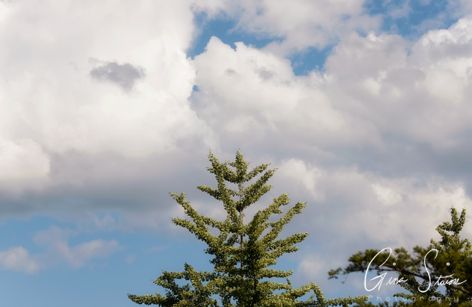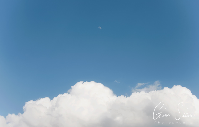 Blue skies and the moon above the clouds on a spring afternoon in Toronto, Ontario, Canada.