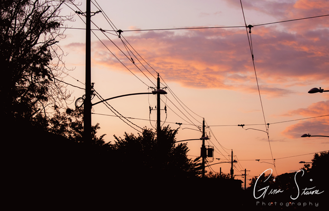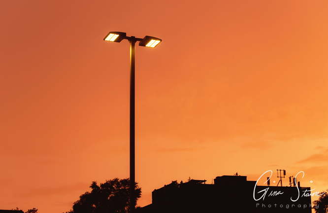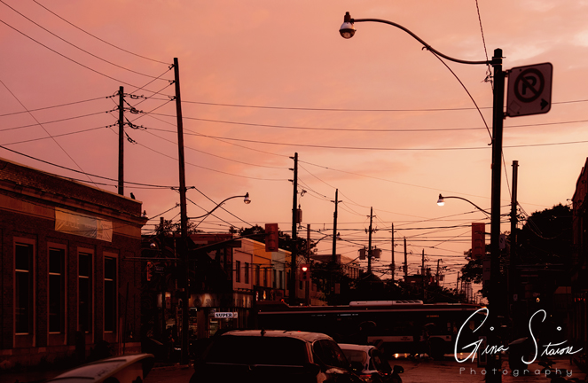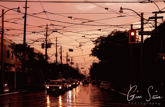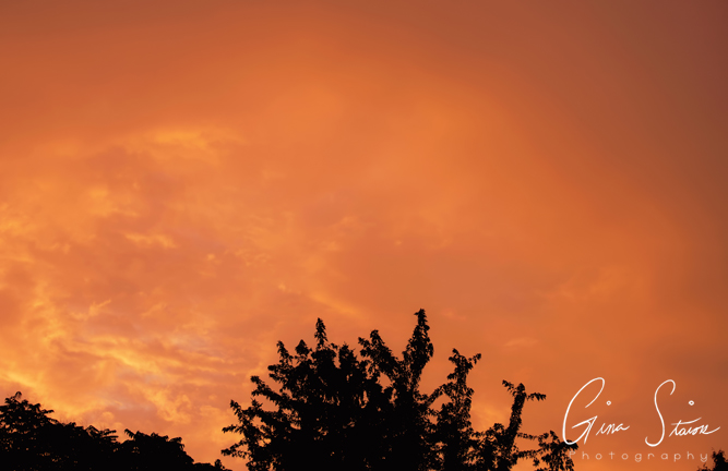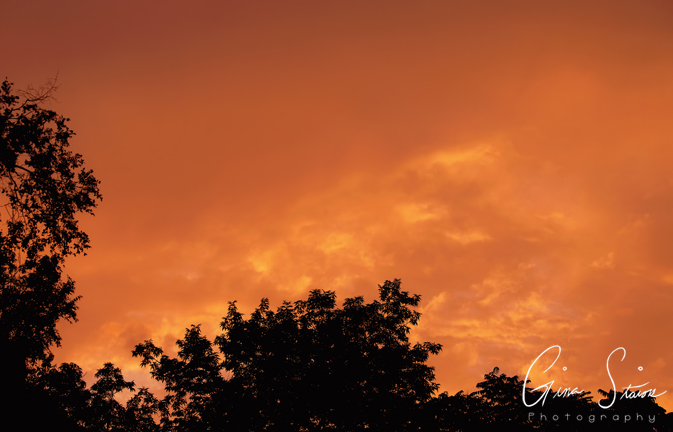 The sky following heavy downpours turns a vivid orange and yellow on a summer evening in Toronto, Ontario, Canada.