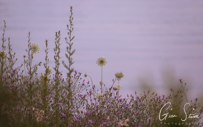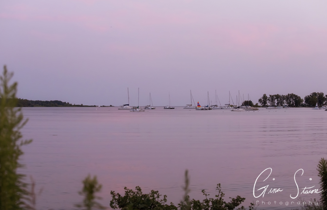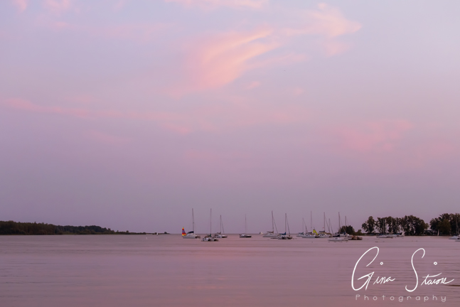 A soft pink and purple sunset is a perfect backdrop to a quiet evening by the lake in Toronto, Ontario, Canada.