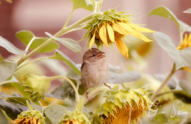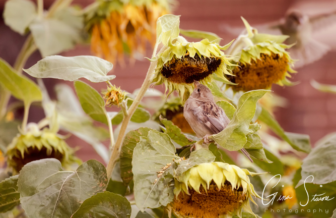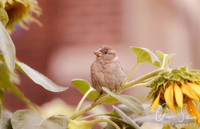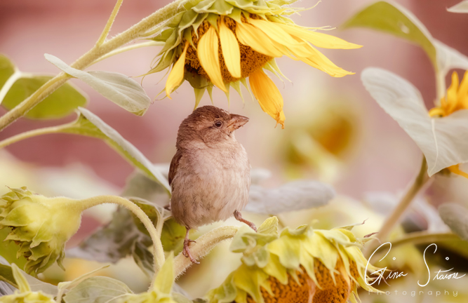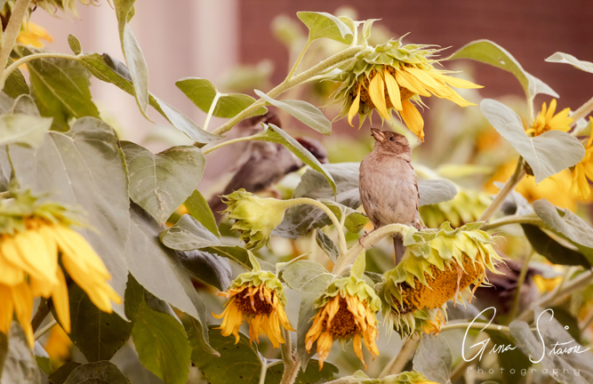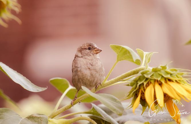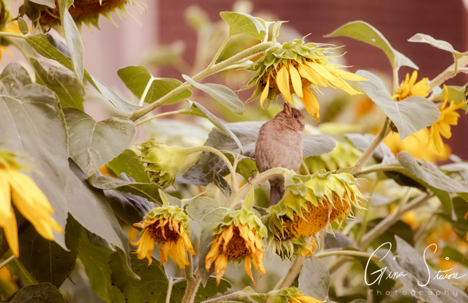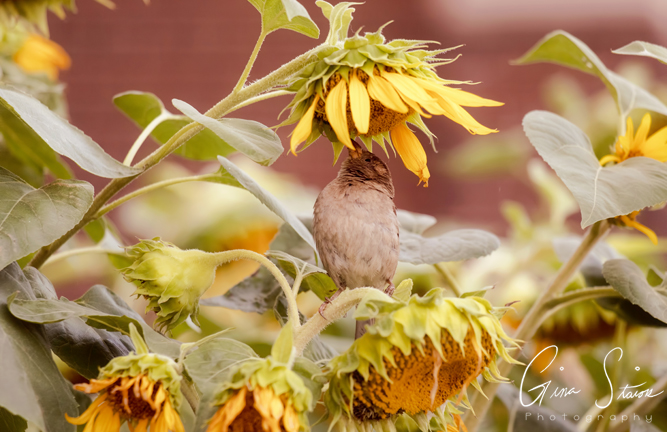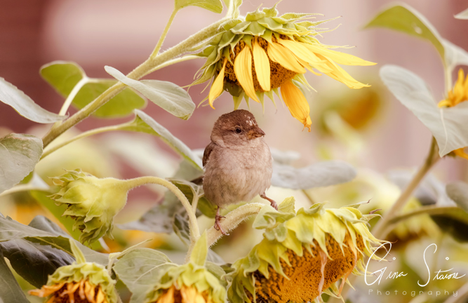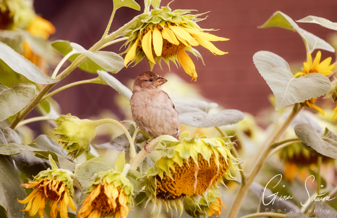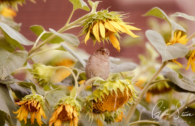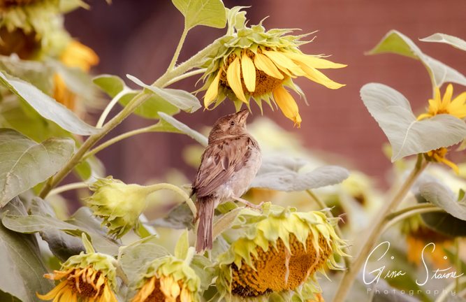 A cute house sparrow spends a moment by the blooming sunflowers on a summer afternoon in Toronto, Ontario, Canada.