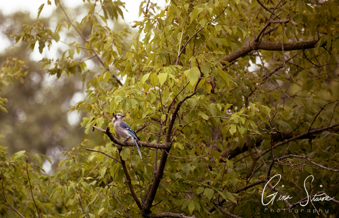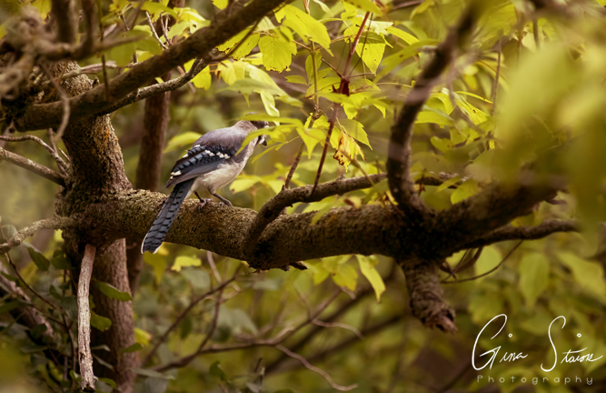 A blue jay surrounded by leaves while perched on a tree branch on a summer afternoon in Toronto, Ontario, Canada.